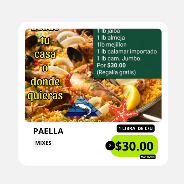 Disfruta de la frescura y calidad del Mix de Paella, una mezcla cuidadosamente seleccionada para garantizar una experiencia gastronómica única. Perfecto para recetas tradicionales como la paella española, este mix combina la suavidad del camarón, la firmeza del calamar y el sabor intenso de la jaiba y los mejillones. Su versatilidad permite múltiples formas de preparación, desde una versión clásica con azafrán y arroz hasta una mariscada con especias y vino blanco.
